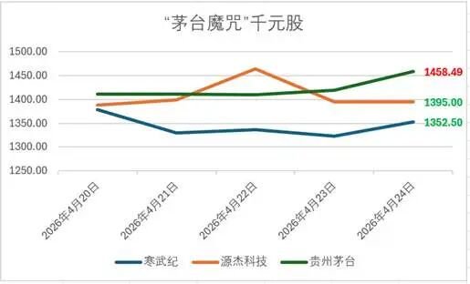 寒武纪则在十一连阳后出现调整,但在外部因素(周五在美股半导体龙头英特尔和德仪交出靓丽财报并双双大涨)及内部因素( DeepSeekV4昇腾首发,寒武纪全面适配Deep Seek)影响下一度冲高至1409.58元,但最终回落至1350元附近,仿佛真受魔咒影响。