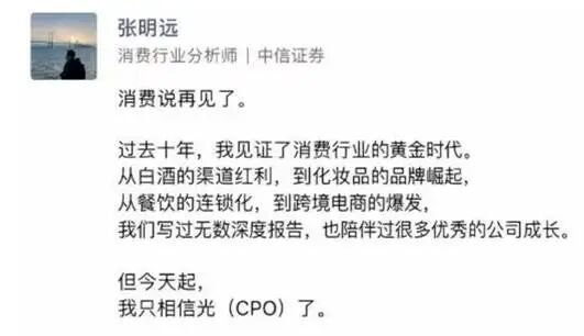 近期光的狂热不但让投资者趋之若鹜,更有行业研究员本声称要转行。4月22日晚,更有传言称一位名为“张明远”的某信证券消费行业分析师在朋友圈发文称未来“只相信光(CPO光模块)”。