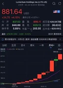 Lumentum Holdings(LITE.US),美国光通信龙头公司,核心产品包括激光器、光芯片、光模块组件等。LITE股价自2025年5月开始上涨,至今连续上涨12个月,从45美元一线涨至最高960美元,最新收盘881.64美元,一年涨幅20倍。