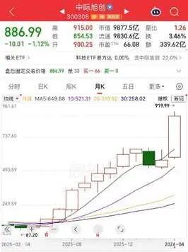 中际旭创(300308.SZ),全球领先的中国光模块(800G/1.6T)公司,2025年4月探至低点67.20元,随后一路走高,2026年4月最高股价919.99元,最新收盘886.99元,12个月涨幅13倍;源杰科技(688498.SH),中国头部光芯片(DFB激光器)公司,2025年4月见到低点88.10元,随后一路上扬,2026年4月创出历史新高1496元,最新收盘价1395元,一年最高涨幅17倍。