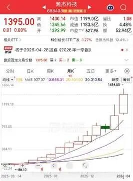 A股佰维存储(688525.SH),2022年12月上市,发行价12.99元,2025年9月启动,从60-70元一线涨至今年4月最高的294.99元,8个月涨幅4-5倍。