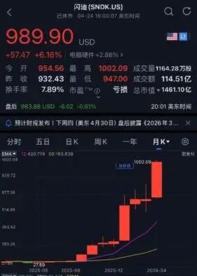闪迪(SNDK.US),全球五大NAND闪存半导体供应商之一,2025年2月从西部数据(Western Digital)分拆出来并登陆纳斯达克交易所,发行价37美元,随后震荡半年,最低探至27.89美元,并于2025年9月开始拉升至今,目前股价989.90美元,最高1002.09美元,8个月时间涨幅27倍。