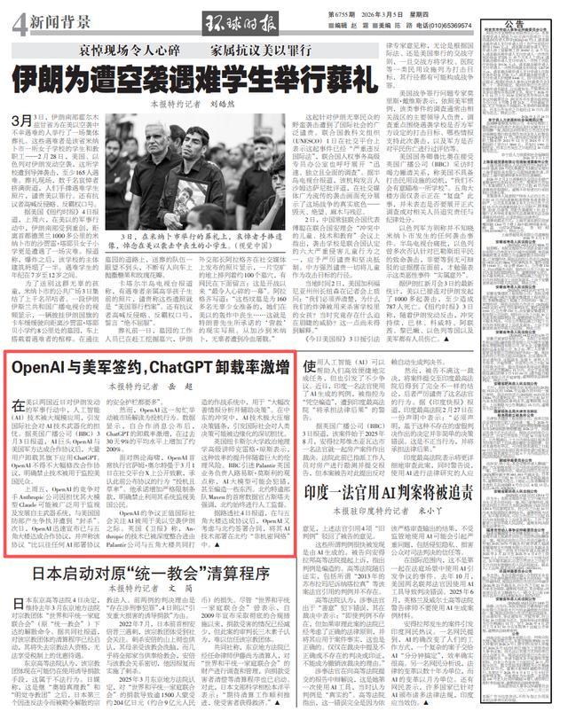 在美以两国近日对伊朗发动的军事行动中,人工智能(AI)技术被大规模应用,引发国际社会对AI技术武器化的担忧。据英国广播公司(BBC)3月3日报道,AI巨头OpenAI与美国军方达成合作协议后,大量用户卸载其旗下应用ChatGPT。OpenAI不得不大幅修改合作协议,明确禁止技术被用于监控美国民众。