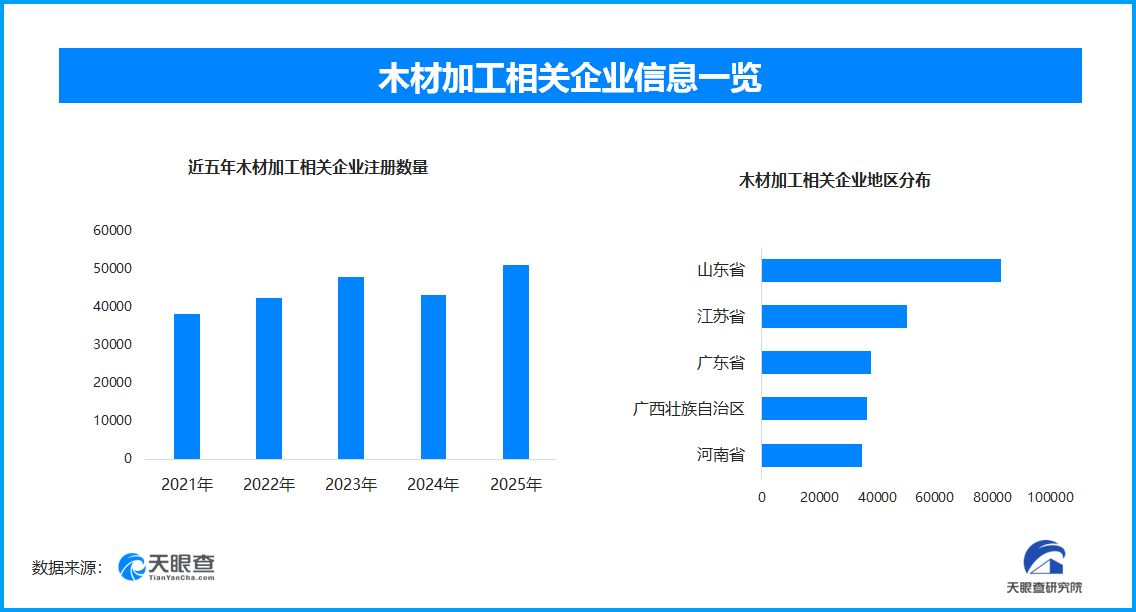 从区域分布来看,山东省、江苏省、广东省木材加工相关企业数量位居前列,分别为超8.3万余家、5万余家和3.7万余家。