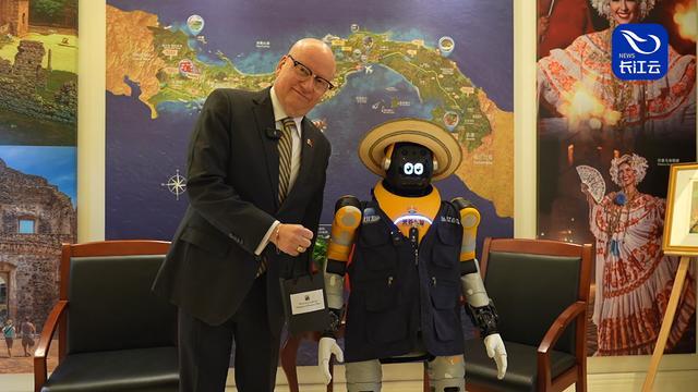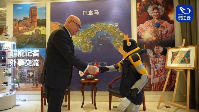 △从左到右:机器人记者江小新、长江云新闻记者刘璐、机器人记者江小云